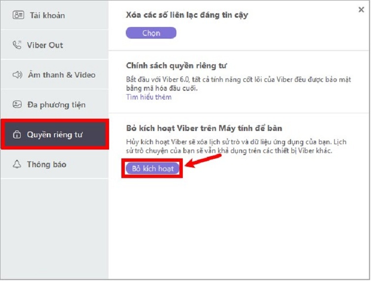 Tiếp theo, bạn chọn Quyền riêng tư rồi chọn Bỏ kích hoạt ở phần Bỏ kích hoạt Viber trên máy tính để bàn.