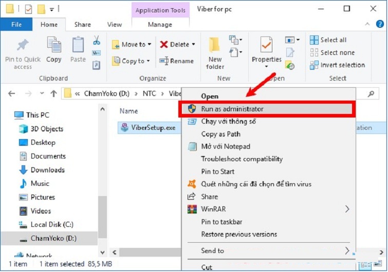 Bước 1: Khi quá trình tải Viber về máy tính đã hoàn tất. Bạn hãy mở đến thư mục chứa file cài đặt viber vừa được tải về. Sau đó, bạn tiến hành nhấp chuột phải vào file ViberSetup.exe rồi chọn mục Run as administrator.