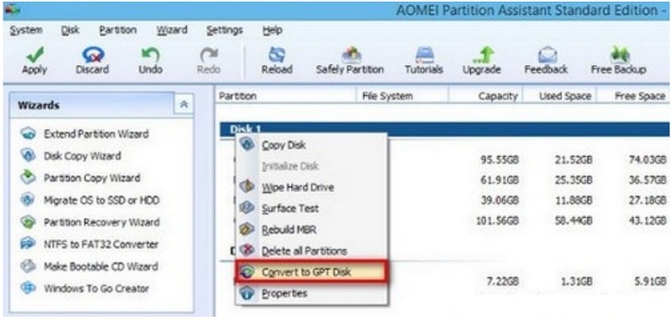 - Khởi chạy AOMEI Partition Assistant Professional. Chọn ổ cứng cần chuyển đổi và nhấp vào menu "Convert" → "Convert to GPT".