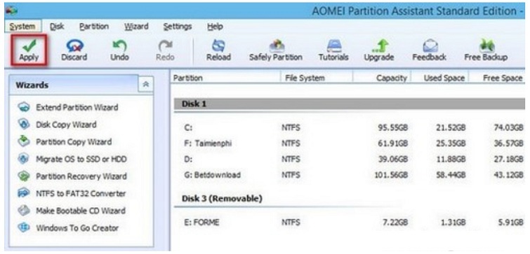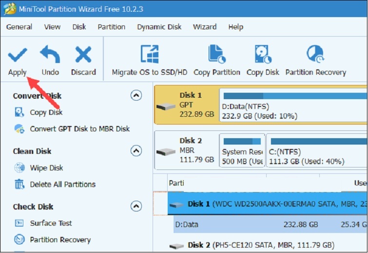 - Nhấn nút "Apply" ở góc trái dưới để bắt đầu quá trình chuyển đổi. Quá trình này có thể mất từ 10-30 phút tùy thuộc vào dung lượng ổ cứng.