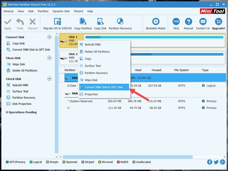 - Trong giao diện chính, nhấp chuột phải vào ổ cứng cần chuyển đổi (thường là Disk 0) và chọn "Convert MBR Disk to GPT Disk".