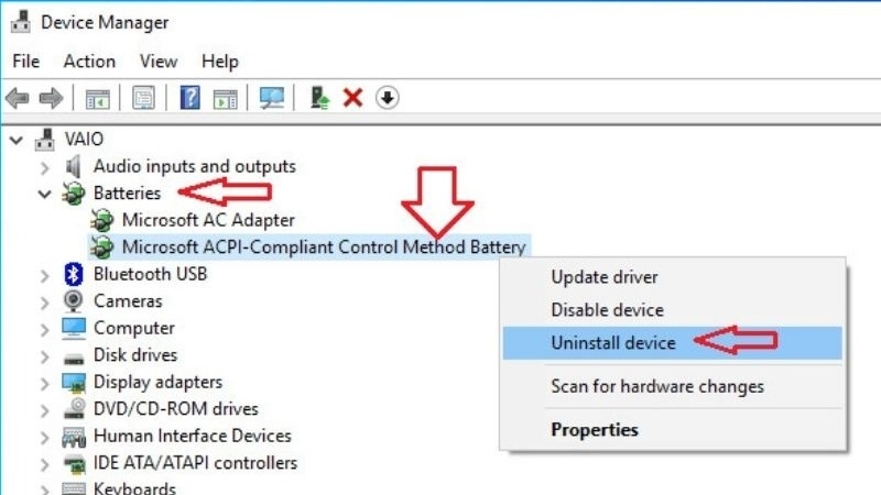 - Vào Device Manager (trên Windows), tìm Battery, gỡ driver ACPI-Compliant và restart máy để Windows tự cài lại.