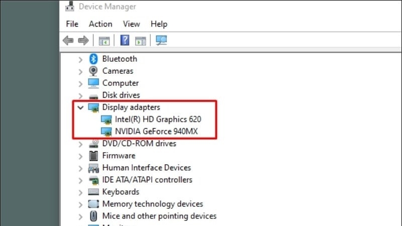 - Xác định loại GPU: Nhấn Windows + X, chọn Device Manager > Display adapters để xem tên card (ví dụ: NVIDIA GeForce hoặc Intel HD Graphics).
