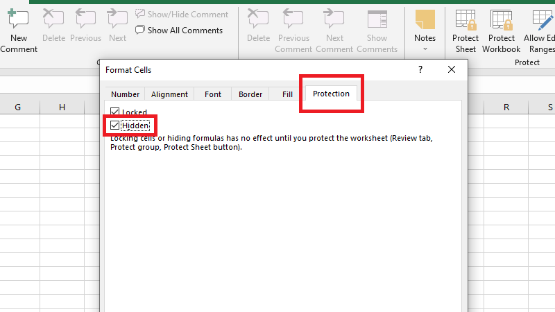 Khi chủ file bật Protect Sheet đồng thời tick tùy chọn Hidden trong Format Cells, công thức sẽ ẩn hoàn toàn trên Formula Bar. Cần thực hiện Cách 4 trước, rồi mới làm bước này.