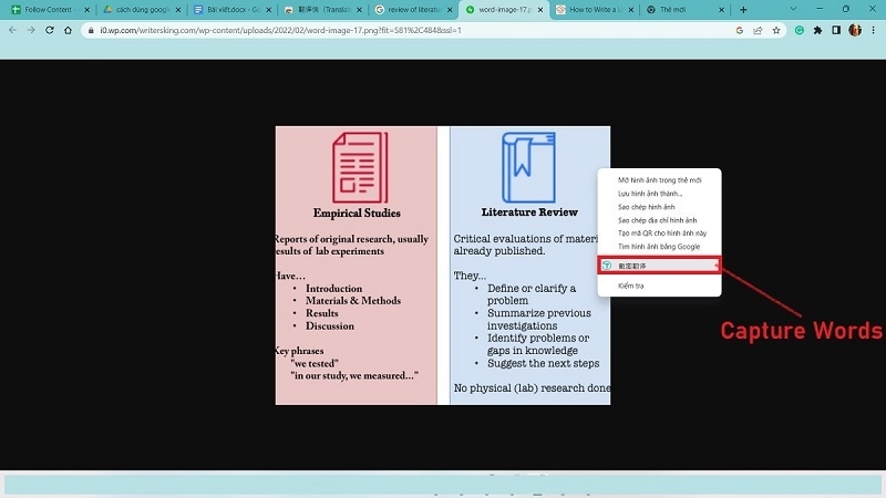 Bước 2: Sau khi cài đặt hoàn tất, bạn chỉ cần click chuột phải lên bất kỳ hình ảnh nào có văn bản cần dịch >> Chọn Capture Words.