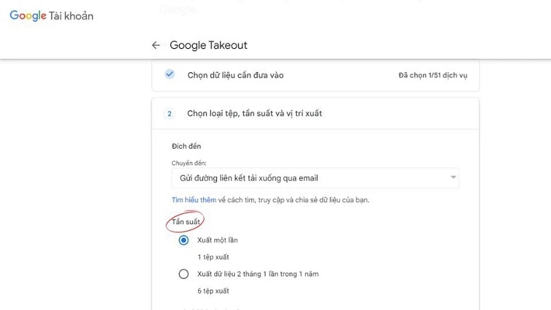 Google Takeout cung cấp hai tùy chọn về tần suất tải dữ liệu: