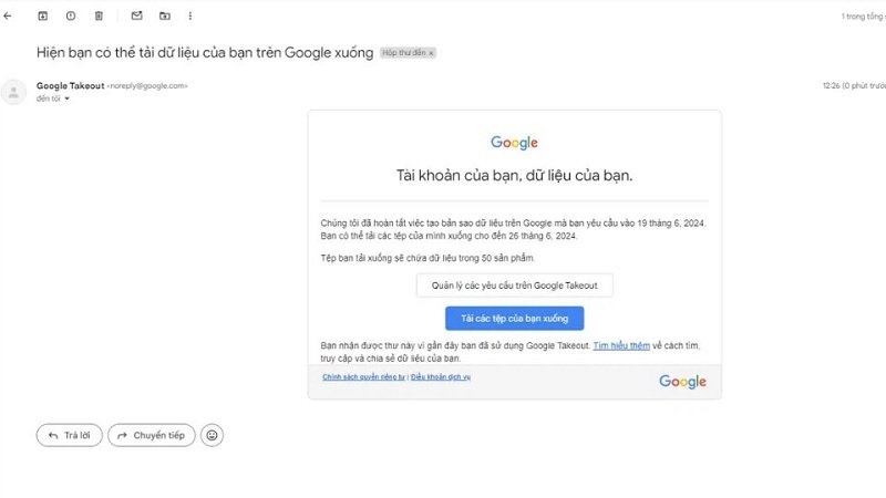 - Sau khi Google hoàn tất việc tạo tệp xuất, bạn sẽ nhận được một email thông báo kèm liên kết tải xuống gửi đến địa chỉ email liên kết với tài khoản Google.