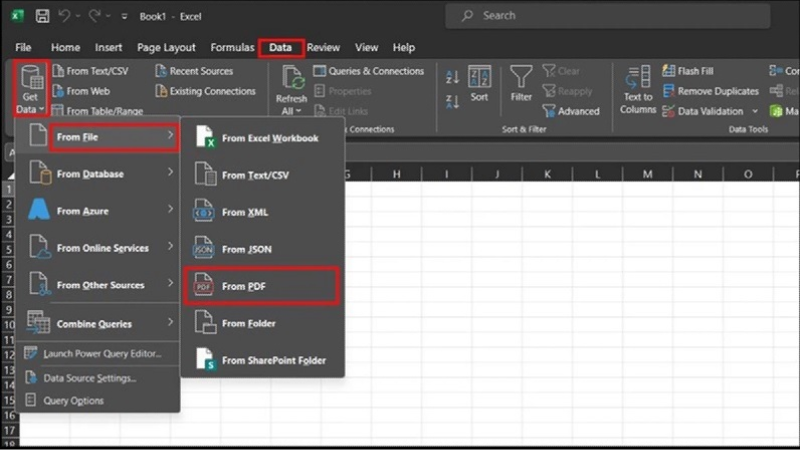- Bước 2: Tại giao diện ứng dụng Excel mới hiển thị, bạn nhấn vào thẻ Data >> Nhấn vào mục Get Data. Sau đó, bạn lần lượt chọn From File >> Chọn From PDF để tiếp tục.