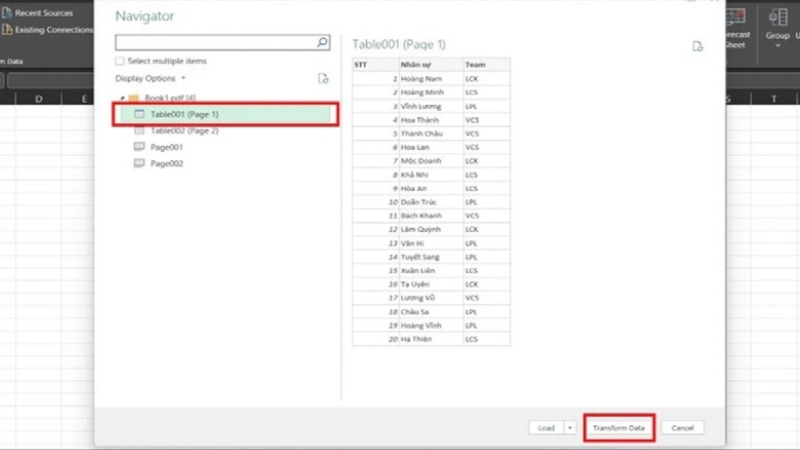 - Bước 4: Tại cửa sổ Navigator, bạn nhấn vào bảng mà bạn cần áp dụng từ file PDF. Để quá trình chuyển bảng từ PDF sang Excel được bắt đầu, bạn nhấn vào nút Transform Data như hình bên dưới: