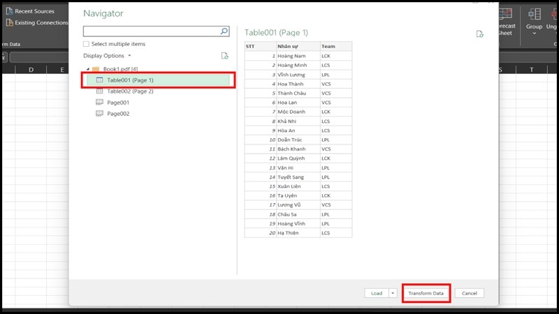 - Bước 5: Chọn bảng cần chuyển: Trong cửa sổ Navigator, xem trước các bảng và chọn bảng phù hợp. Để tinh chỉnh dữ liệu (như loại bỏ cột thừa hoặc sửa lỗi định dạng), nhấn Transform Data. Đây là bước quan trọng để đảm bảo dữ liệu sạch sẽ, tránh tình trạng ô bị lệch hoặc số liệu bị chuyển thành văn bản.