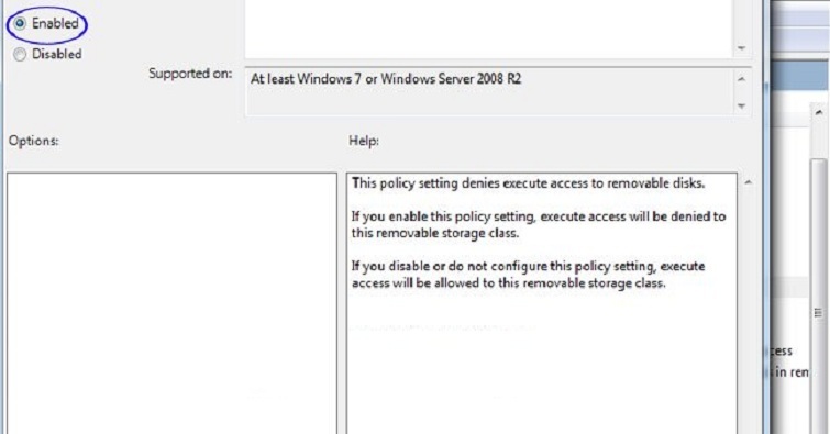 Bước 4: Kích hoạt chính sách: Trong hộp thoại mới, chọn Enabled, sau đó nhấn Apply và OK. Điều này sẽ ngăn chặn việc thực thi file từ ổ đĩa di động, giảm nguy cơ virus lan rộng.