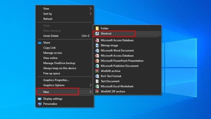 - Bước 1: Nhấp chuột phải vào khoảng trống trên desktop, chọn "New" rồi "Shortcut".