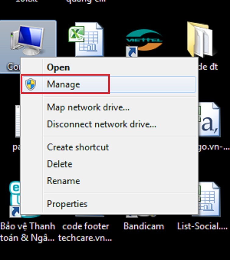 Bước 1: Bạn bắt đầu bằng cách click chuột phải lên biểu tượng This PC (hoặc My Computer) trên màn hình máy tính của bạn. Trong danh sách tùy chọn, chọn "Manage." Điều này sẽ mở cửa sổ Quản lý máy tính.
