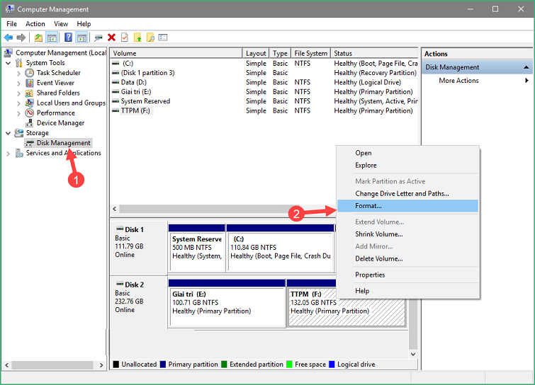 Bước 3: Các bạn muốn Format ổ cứng hoặc phân vùng ổ cứng nào, thì bạn chỉ cần nhấn chuột phải lên phân vùng ổ cứng đó, rồi chọn Format…
