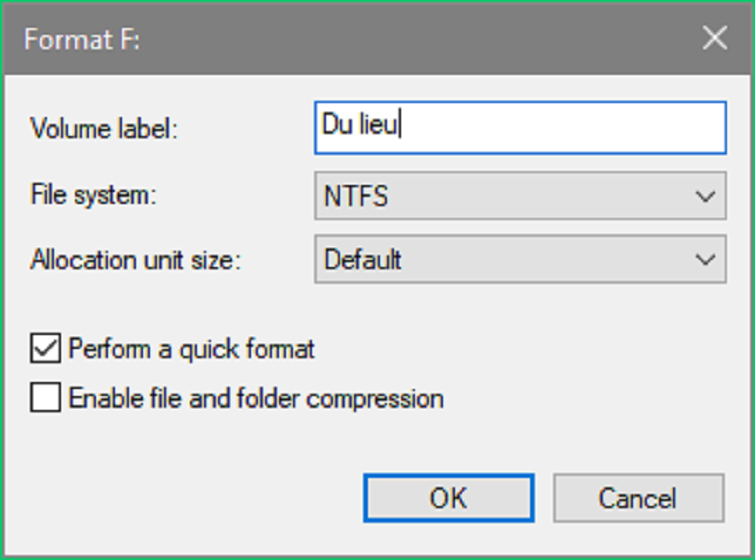 Khi có một cửa sổ hiển thị lên, các bạn cũng có thể đổi tên cho ổ cứng ở trong ô Volume label. Ở mục File system các bạn chọn NTFS, sau đó nhấn vào nút OK.