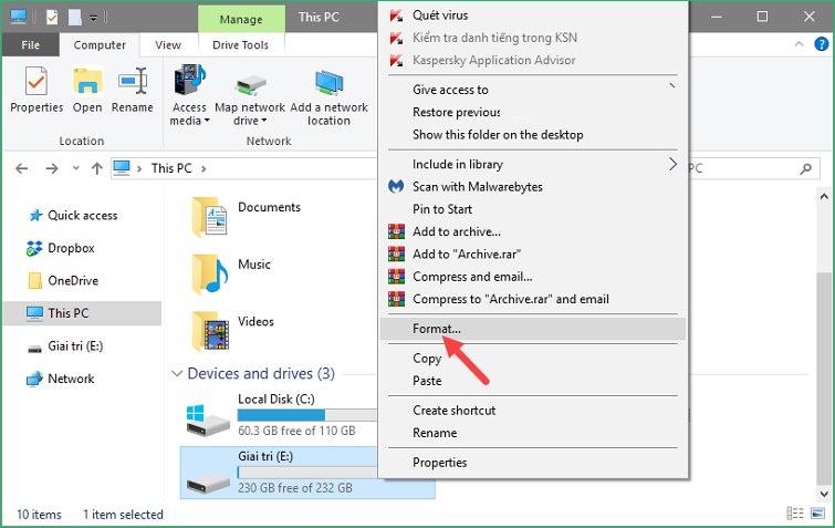 Ngoài cách format ổ cứng như trên, các bạn có thể Format ổ cứng trực tiếp ngay trong thư mục My Computer (This PC) như hình bên dưới: