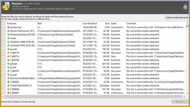 Khi quá trình quét hoàn tất, Recuva sẽ hiển thị danh sách các tập tin đã được phát hiện. Bạn có thể sử dụng các tính năng lọc để thu hẹp kết quả tìm kiếm hoặc tìm kiếm các tập tin cụ thể bằng cách sử dụng chức năng tìm kiếm.