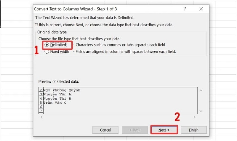 Bước 3: Chọn "Delimited" → tick vào ký tự phân cách (Space, Comma, Tab...) → Finish.