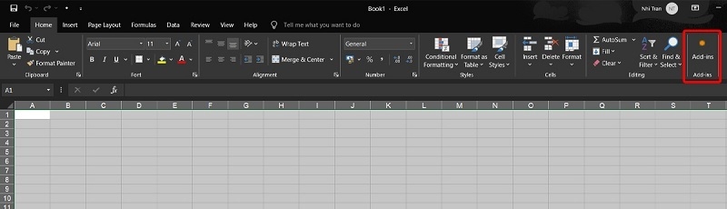 Bước 1: Bạn mở chương trình Excel lên trên máy tính. Sau đó, bạn tìm kiếm và chọn vào công cụ Add-ins nằm ở vị trí góc trên bên phải màn hình.