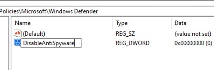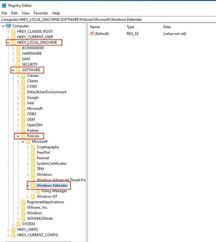 HKEY_LOCAL_MACHINE\SOFTWARE\Policies\Microsoft\Windows Defender