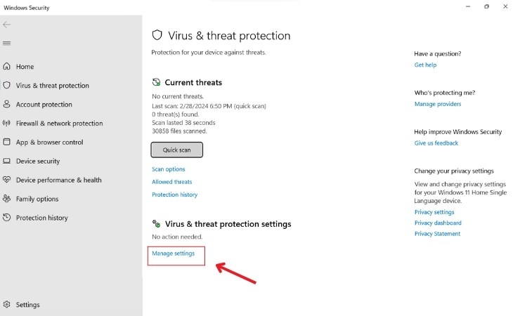 - Trong phần Virus & threat protection settings, click Manage settings.