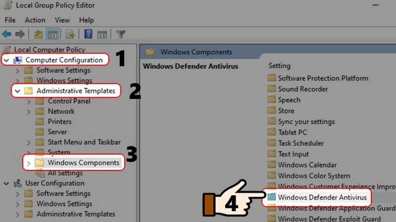 - Điều hướng theo đường dẫn: Computer Configuration > Administrative Templates > Windows Components > Microsoft Defender Antivirus (lưu ý: Tên có thể thay đổi nhẹ tùy phiên bản, trước đây là Windows Defender).
