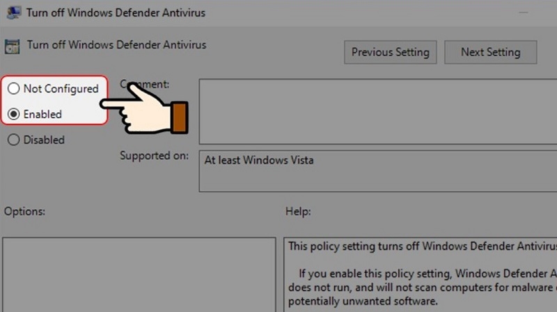 Sau khi thực hiện, Windows Defender sẽ bị vô hiệu hóa hoàn toàn. Nếu muốn bật lại, chỉ cần quay về và chọn Not Configured hoặc Disabled.