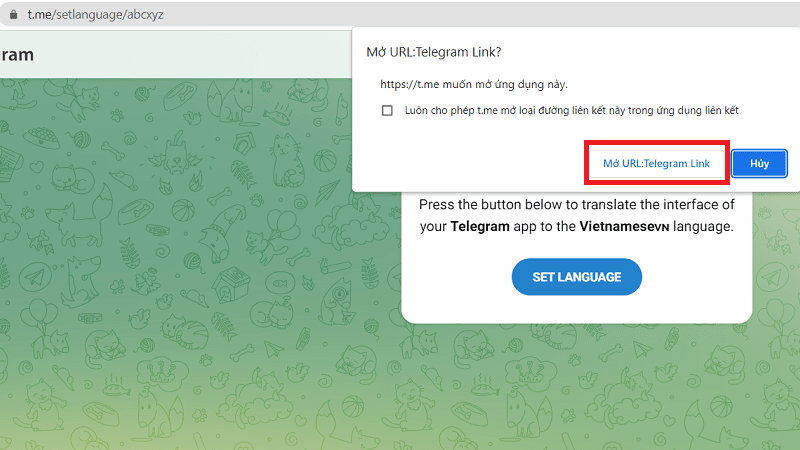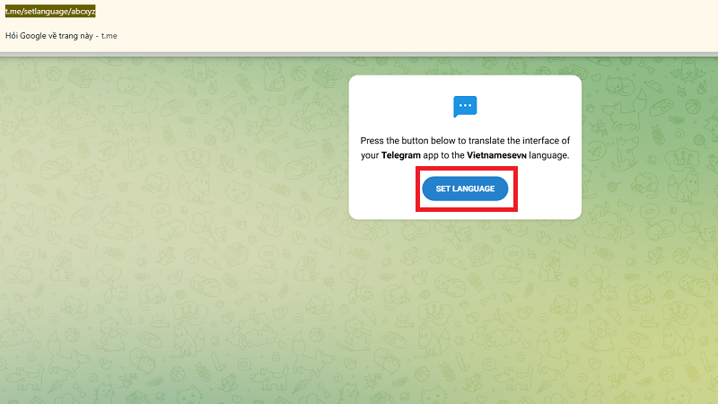 Bước 2: Mở trình duyệt web trên máy tính, truy cập liên kết: https://t.me/setlanguage/abcxyz (bot ngôn ngữ chính thức từ cộng đồng Telegram).
