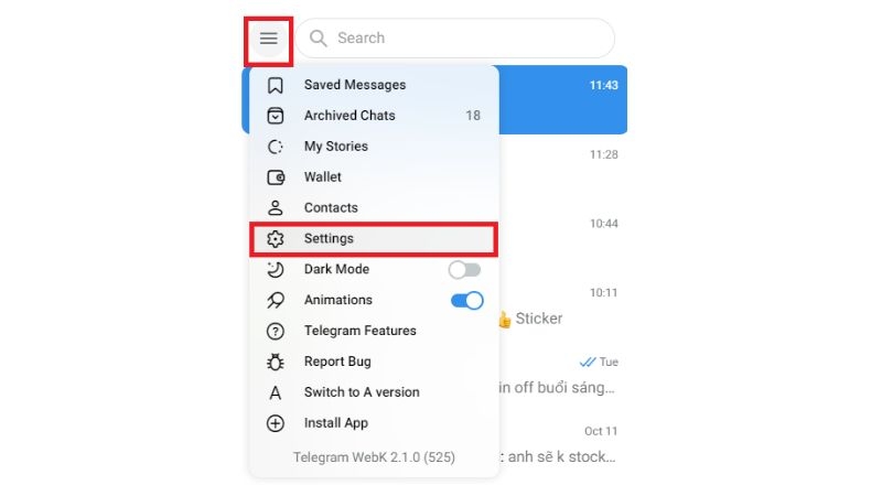 Bước 1: Mở Telegram > Nhấn biểu tượng ba gạch ngang (menu) > Chọn "Setting" (Cài đặt).