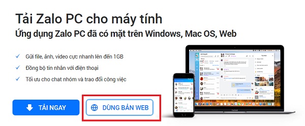 - Bước 1: Bạn truy cập vào trang chủ của ứng dụng Zalo https://zalo.me/pc và chọn Dùng bản web.