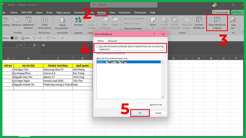 - Tab Review → Share Workbook (Legacy) → bỏ tick “Use the old share workbooks feature instead of the new co-authoring experience”