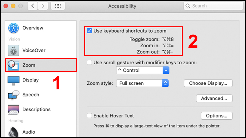 Bước 1: Trước tiên, bật tính năng: Vào System Settings > Accessibility > Zoom > tích Use keyboard shortcuts to zoom.