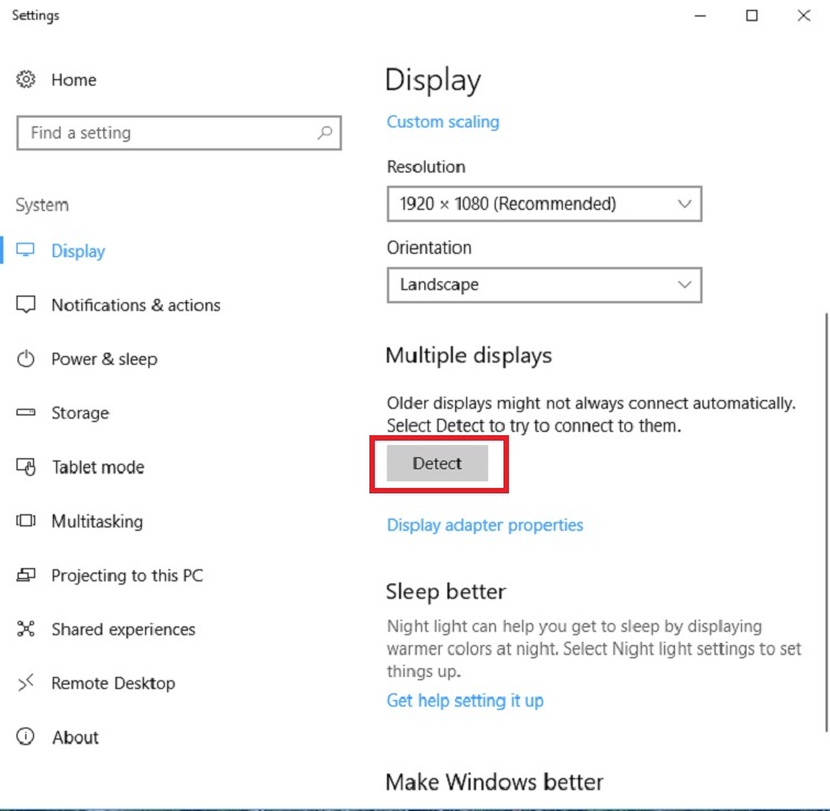 Khi cửa sổ mới xuất hiện, hãy cuộn xuống và nhấn vào "Detect" để tìm kiếm và chọn thiết bị máy chiếu đang được kết nối với laptop hiện tại.