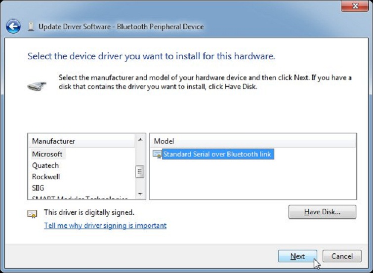 Tại phần "Manufacturer", chọn "Microsoft". Trong "Model", chọn "Standard Serial over Bluetooth link (COM)" – đây là driver tiêu chuẩn cho các thiết bị Bluetooth ngoại vi.