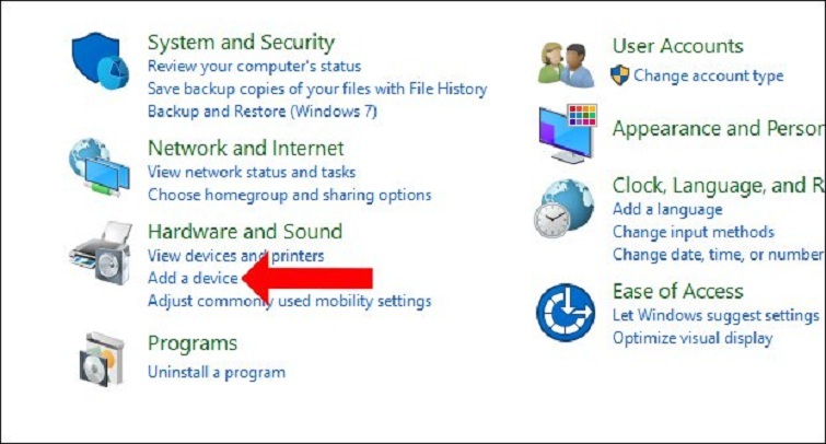 Mở Control Panel (tìm kiếm trong Start Menu), chọn "Hardware and Sound" > "Devices and Printers" > "Add a device".