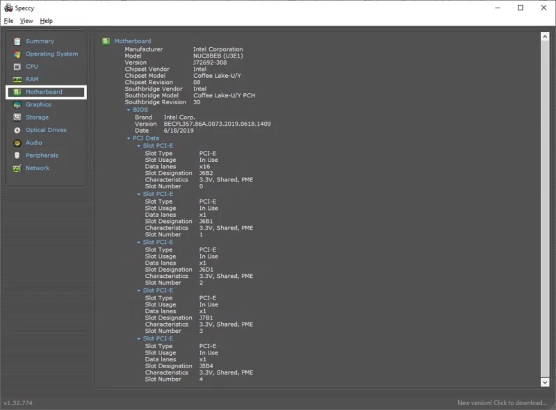 Speccy do Piriform phát triển, có giao diện thân thiện và dễ sử dụng. Thông tin bo mạch chủ được hiển thị rõ ràng ở tab "Motherboard".