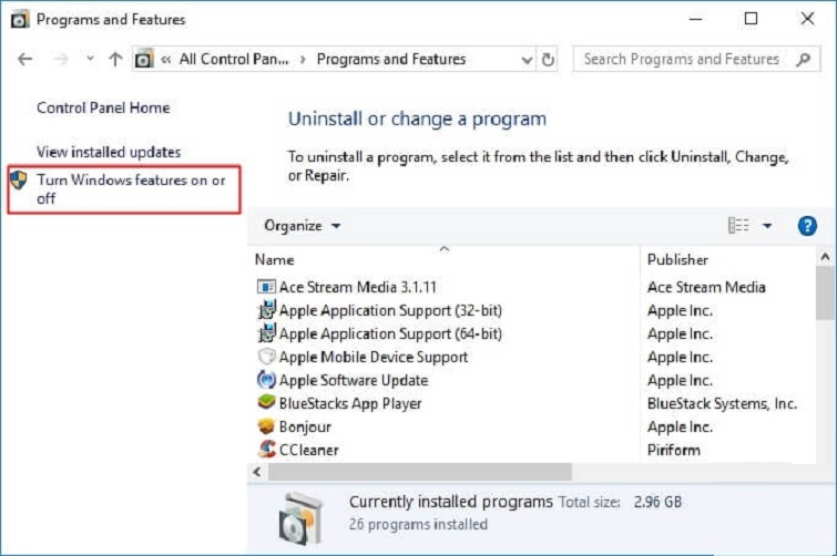 Bước 3: Từ danh sách nằm phía bên trái, các bạn nhấn chọn vào mục Turn Windows features on or off.