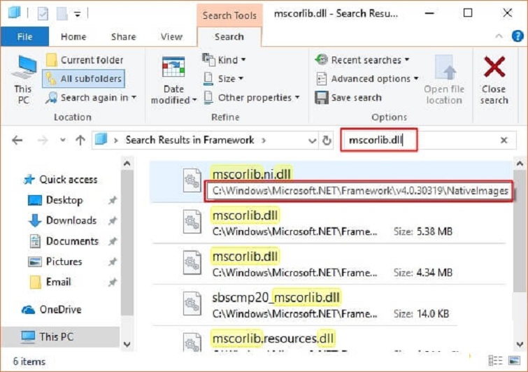 Bước 3: Tiếp theo, để kiểm tra phiên bản .NET Framework bạn đang sử dụng, hãy nhập "mscorlib.dll" vào ô tìm kiếm ở góc trên bên phải. Kết quả sẽ hiển thị ngay lập tức. Với thư mục xuất hiện đầu tiên cho biết bạn đang sử dụng phiên bản .NET Framework tương ứng với thư mục đó.