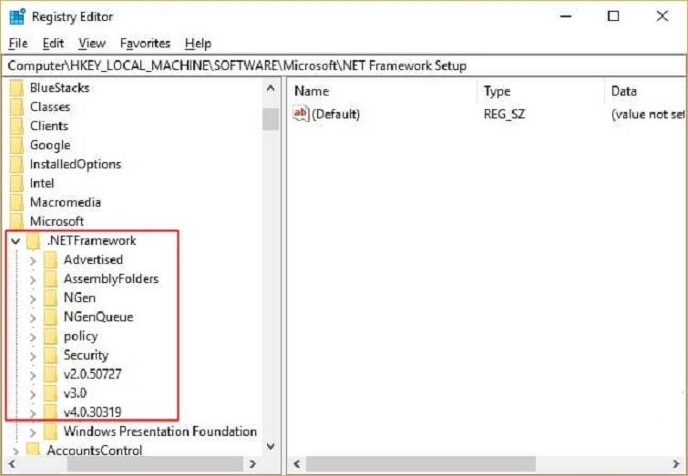 Bước 3: Cuối cùng, bạn có thể tiếp tục truy cập đến thư mục .NET Framework Setup theo đường dẫn Computer\HKEY_LOCAL_MACHINE\SOFTWARE\Microsoft\NET Framework Setup để tiến hành kiểm tra lại một lần nữa.