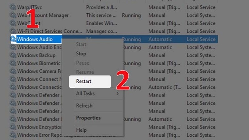 - Tìm "Windows Audio" > Nhấp chuột phải > Stop, sau đó Start lại.