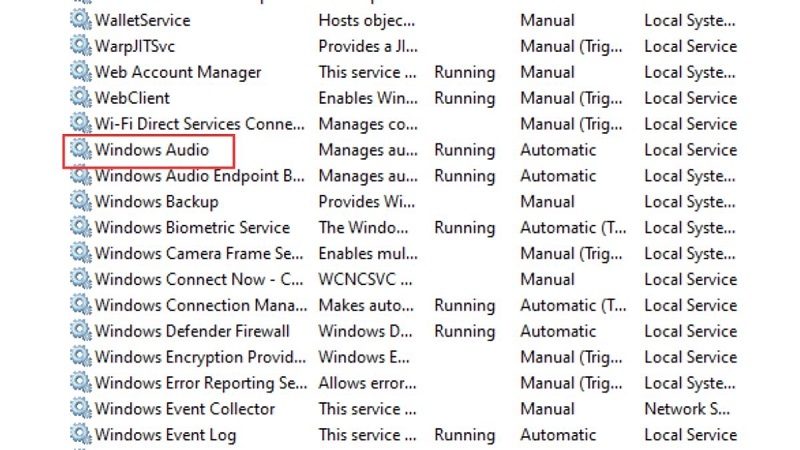 - Kiểm tra các service liên quan như "Windows Audio Endpoint Builder" và "Remote Procedure Call (RPC)" phải ở trạng thái Running.