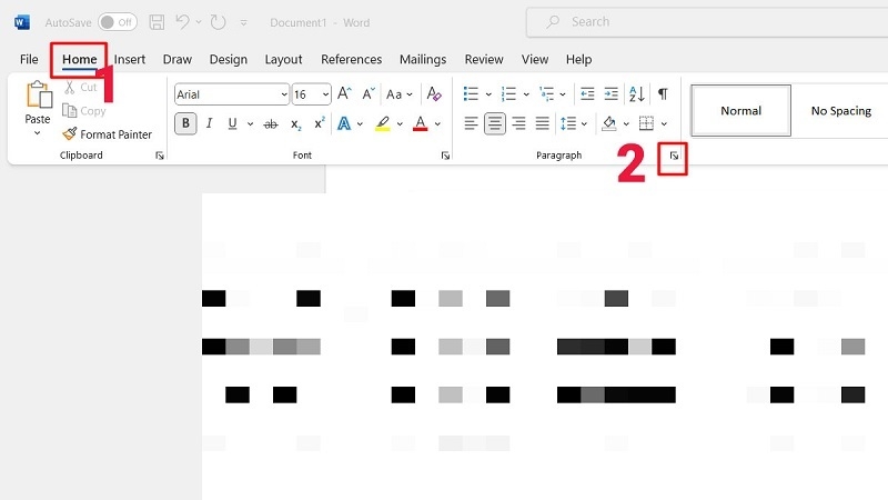 Bước 1: Tại tài liệu Word đang gặp sự cố nhảy trang, bạn nhấn vào thẻ Home ở thanh công cụ. Sau đó, bạn nhấn vào biểu tượng mũi tên nằm ở vị trí góc dưới bên phải mục Paragraph.