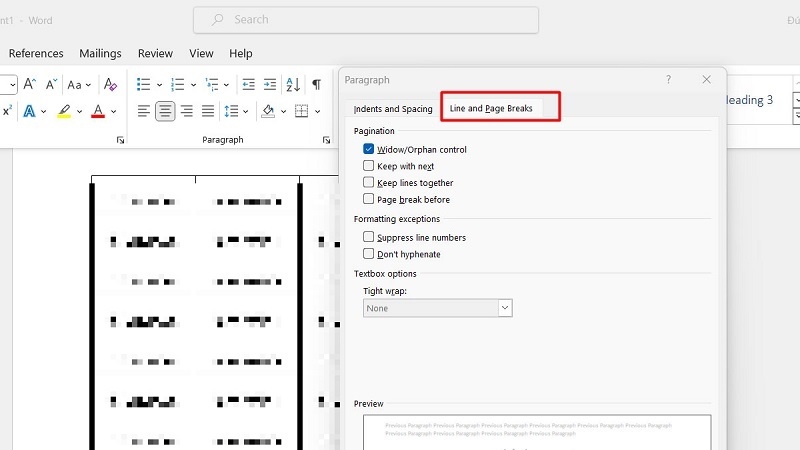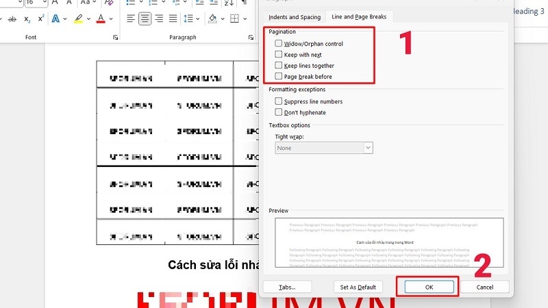 Bước 2: Khi menu mới hiển thị, bạn nhấn vào tab Line and Page Breaks. Tiếp theo, bạn bỏ chọn toàn bộ các tùy chọn ở phần Pagination như hình bên dưới: