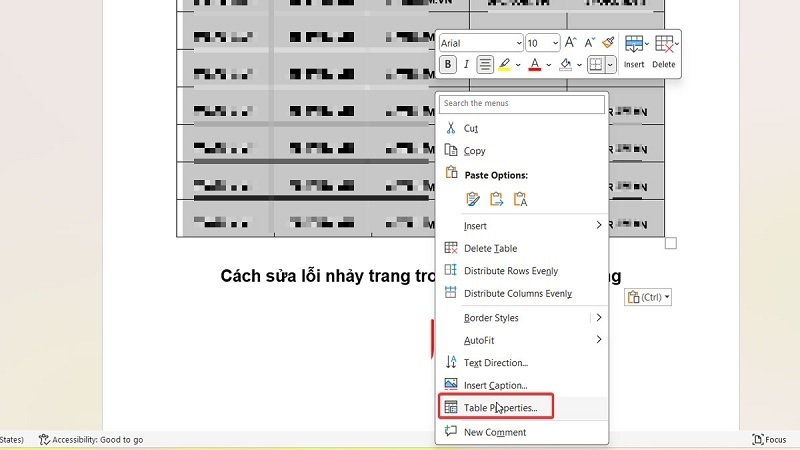 Bước 1: Bạn mở file Word bị lỗi nhảy trang lên trên máy tính. Tiếp theo, bạn click chuột phải lên bảng rồi nhấn vào tùy chọn Table Properties.