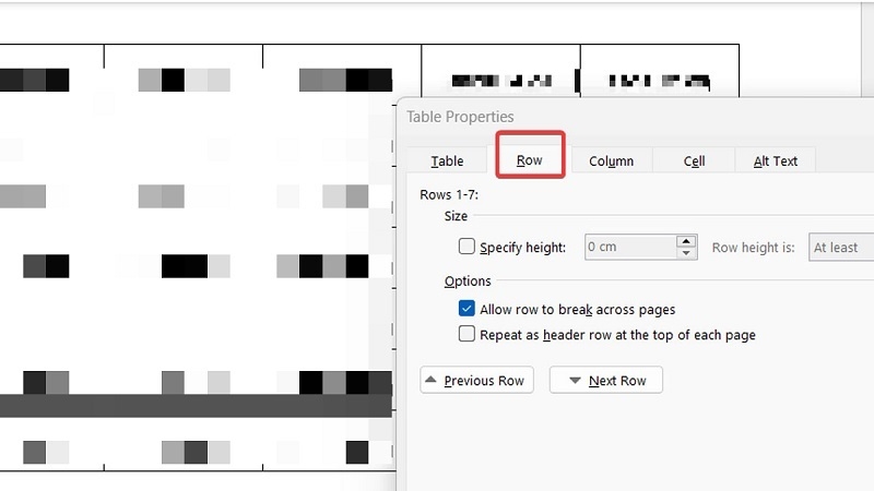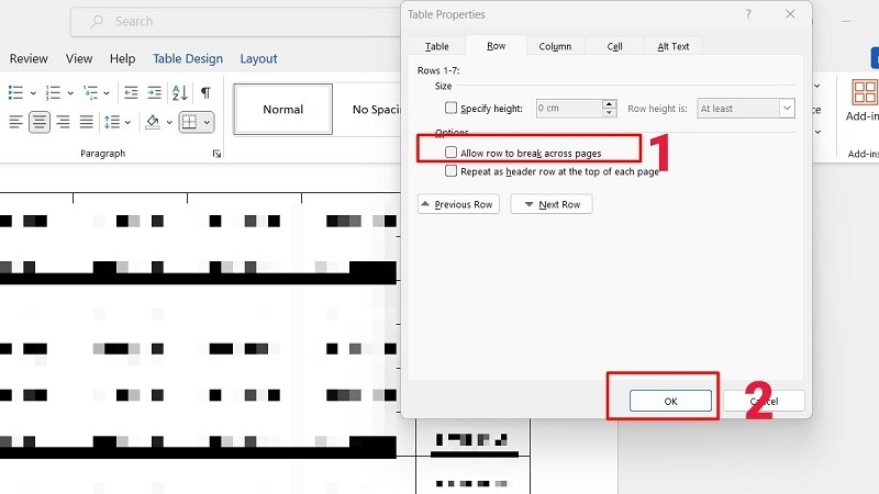 Bước 3: Tiếp theo, bạn bỏ chọn tại dòng chữ Allow row to break across pages. Cuối cùng, bạn nhấn nút Ok là xong.