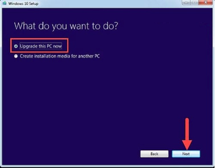Ở đây, chúng tôi sẽ chọn Upgrade this PC now rồi nhấn vào Next .