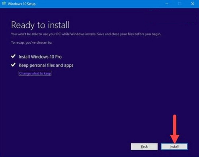 Bước 7: Sau khi các bước kiểm tra đã được thực hiện hoàn tất. Bây giờ, các bạn chỉ cần bấm vào Install để có thể cập nhật win 7 lên win 10.