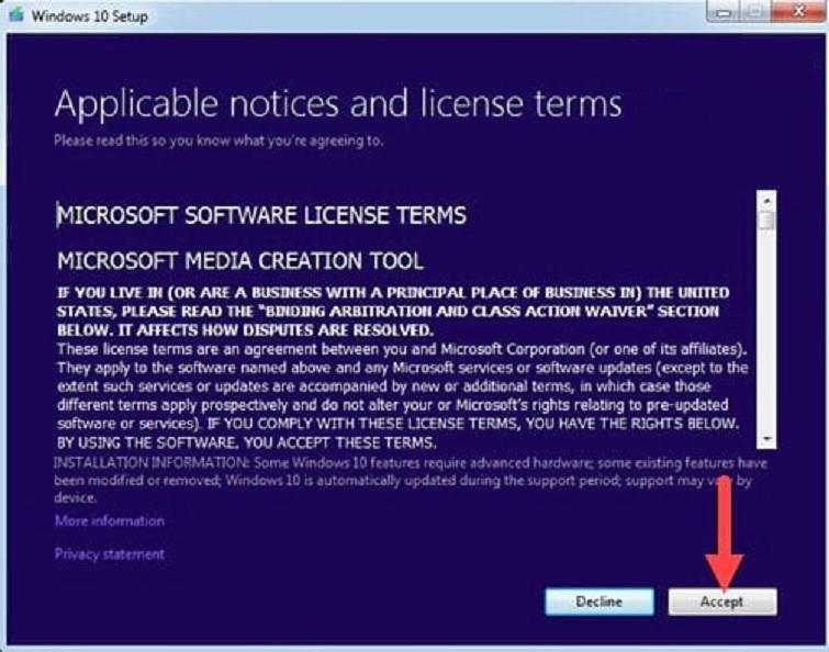 Bước 2: Sau khi bạn đã tải về hoàn tất, hãy tiến hành chạy Media Creation Tool và nhấn vào đồng ý với các điều khoản để tiến hành nang cap win7 len win 10.