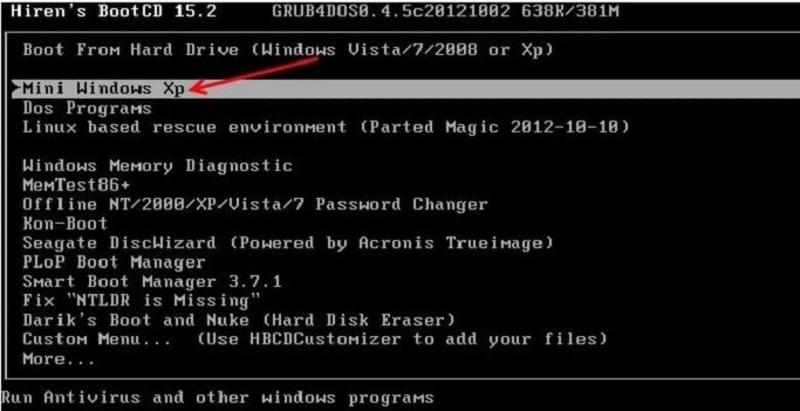 Chọn Mini Windows XP từ menu Hiren’s Boot.