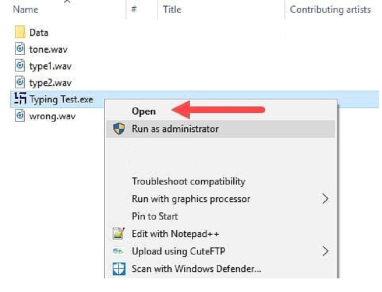 Bước 3: Tiếp theo, bạn truy cập vào thư mục chứa phần mềm Typing Test. Click chuột phải và chọn "Open" để mở thư mục.